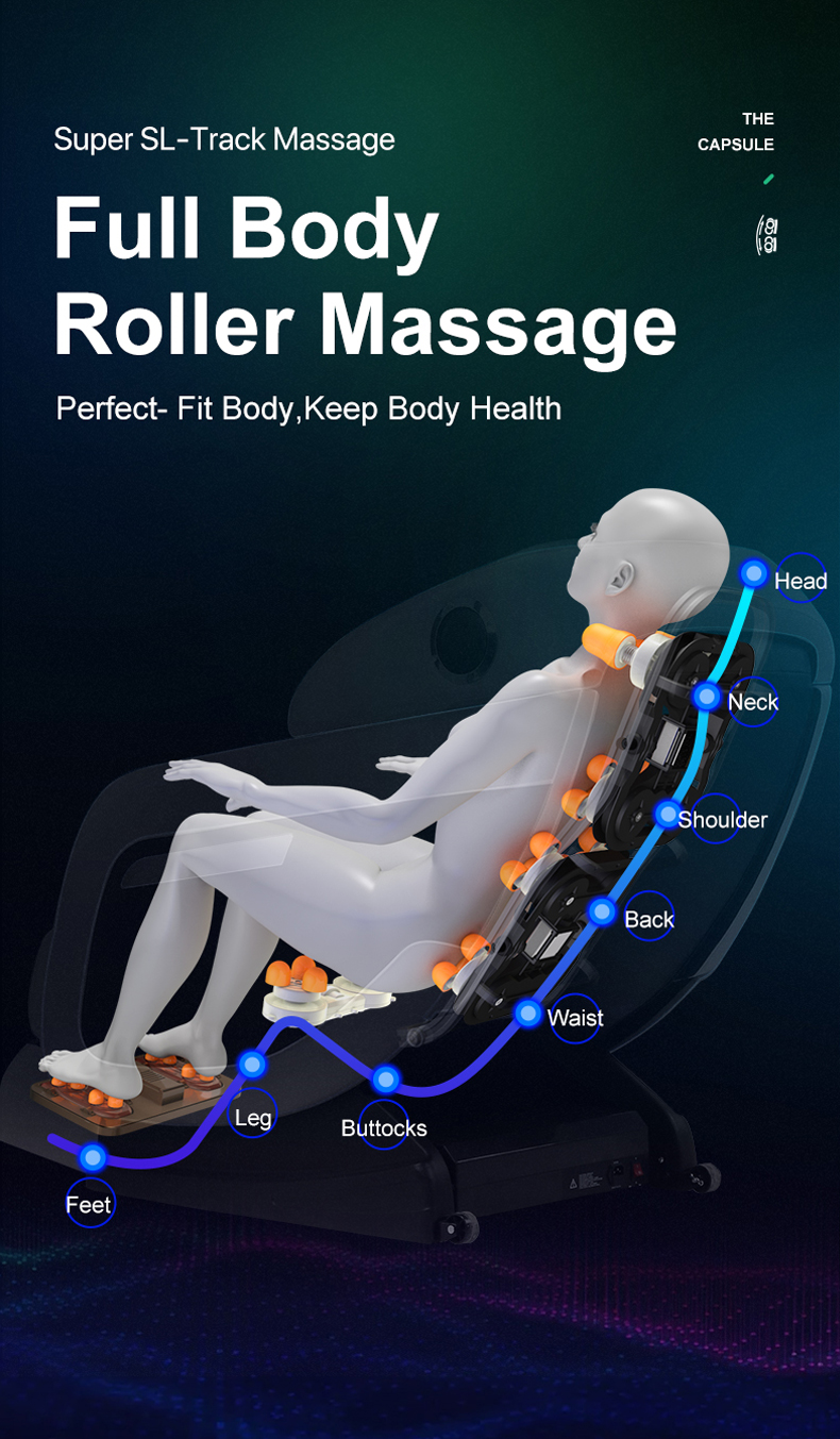 Các bi lăn được thiết kế chạy dọc đường ray SL 135 cm di chuyển dọc theo cột sống và ôm sát cơ thể từ cổ vai xuống mông giúp massage vùng cổ vai, lưng, mông.